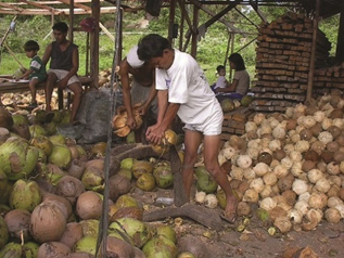 フィリピンで手作業でココナッツの殻をむいています。ローテク、小規模生産者、高品質の食品、JOBS! 写真著作権: Brian Shilhavy