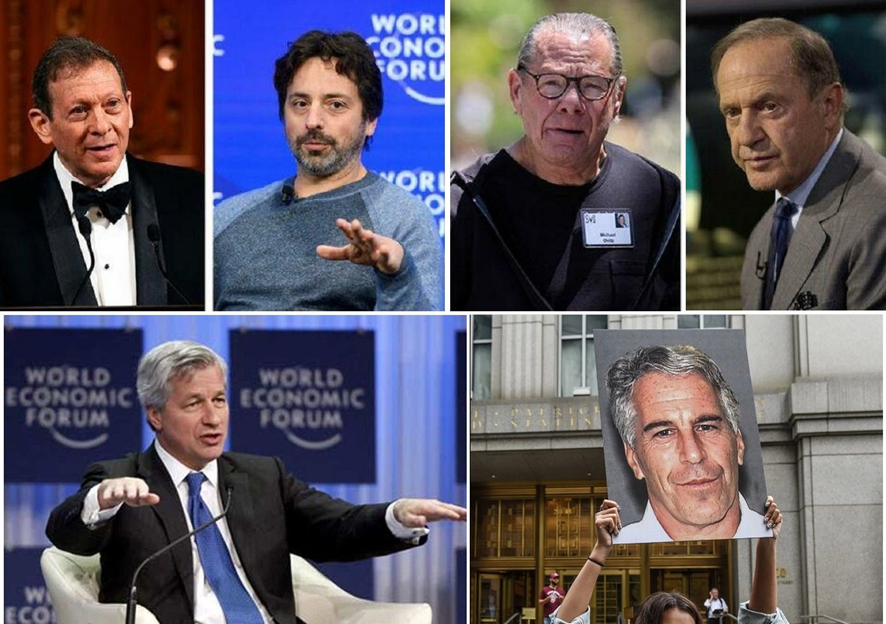 上段: ハイアット ホテルのエグゼクティブ チェアマンである Thomas Pritzker、Google の共同創設者である Sergy Brin、ベンチャー キャピタリストで Creative Artists Agency の共同創設者である Michael Ovitz、US News & World を所有する不動産億万長者の Mort Zuckerman報告。下段: JPMorgan Chase CEO、Jamie Dimon、Jeffrey Epstein の写真。