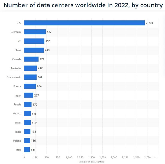 このカテゴリーでは、米国には深刻な競争相手がいません。実際、Statista.comによると、米国は世界の他のほぼすべての国を合わせたよりも多くのデータセンターを所有しています。
