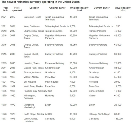 そのページには、1977 年以降に建設された 16 の新しい製油所がリストされており、その中には 2021 年に建設された 2 か所が含まれます (上の図を参照)。