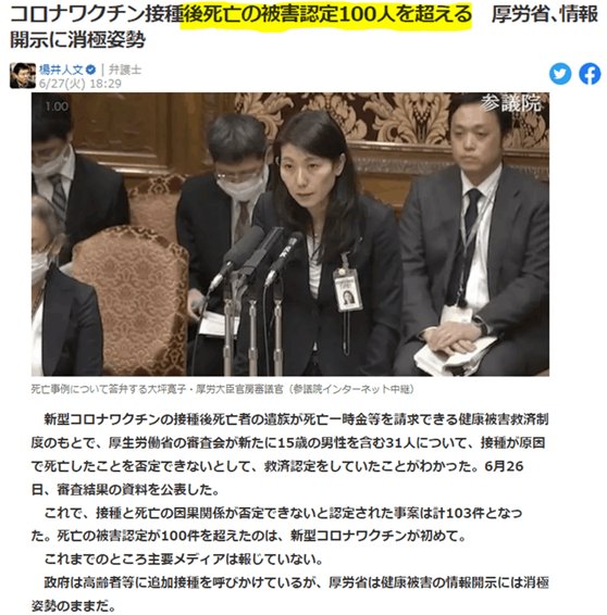 ワクチンが原因で亡くなったことが否定できないとして、被害認定された人が100人を超えた。3桁に及ぶ人命を奪った医薬品は厚労省の歴史上初めてのことに違いなく、かつ、それが中止されることなくいまだに推奨されていることも初めてのことだろう。