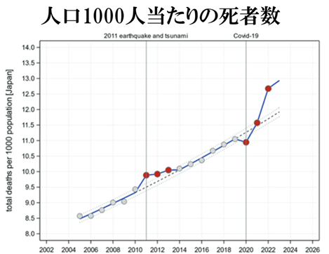 人口1000人あたりの死者数が、2005年以降増加傾向なのは、高齢化社会によるもの。また、2011年の急増は東日本大震災とそれに伴う津波による。