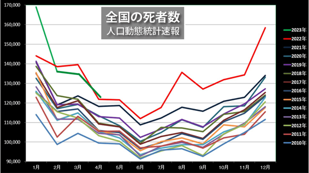 死者数の増加がとどまるところを知らない。2023年1月の死者数は戦後最大で、なんと、人口動態統計速報のグラフの縦軸に収まりきらなかったため、スケールの改変を余儀なくされたほどの増加ぶりだった。