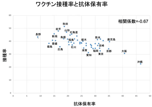 負の相関が見て取れるだろう(r=-0.67)。つまり、接種率の高い県ほど、抗体保有率が低い。打てば打つほど、抗体がなくなってしまうということです。