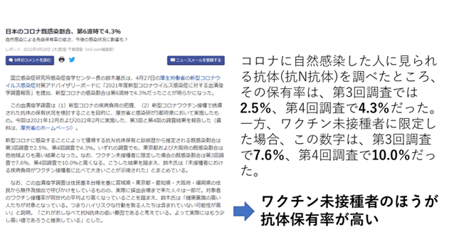 コロナにかかると抗体(抗N抗体)ができるんですね。その保有率を調べたところ、第3回調査で2.5%、第4回調査で4.3%だった。しかしこの数字、未接種者に限定すると、第3回調査で7.6%、第4回調査で10.0%だった。つまり、未接種のほうが抗体保有率が高い。ワクチンを打っていると、せっかくできるはずの抗体がなくなっているということです。