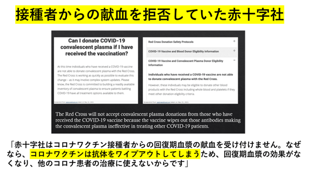 当初、赤十字社はコロナワクチン接種者からの献血を拒否していました。その理由について、赤十字社自身が説明しています。「コロナワクチンは抗体をワイプアウトしてしまうからです」と。