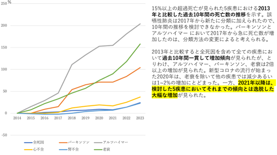 グラフを見ると、どの疾患も2014年以降、一貫して増加していることが分かる。ただ問題は、その増え方です。2021年以降の増え方に注目してください。それまでの増え方とは明らかに急角度に増えている。こういうのを統計学では「それまでの傾向を逸脱した増加」と言います。