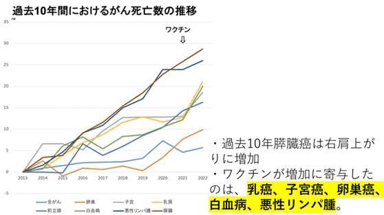 つまり、乳癌、子宮癌、卵巣癌、白血病、悪性リンパ腫については、ワクチンが増加に寄与したと考えられる。
