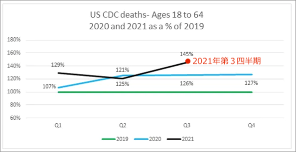 そして、2021年の秋には、米国内では新型コロナによる死亡者数が前の波から急激に減少したにもかかわらず、労働人口の死亡率が極端かつ突然増加した。2021年の第3四半期には、35~ 44歳の労働者の死亡者数がパンデミックのピークに達し、新型コロナウイルス感染症以前の 3年間の基準値を 101%上回るか、または 2倍に達した。