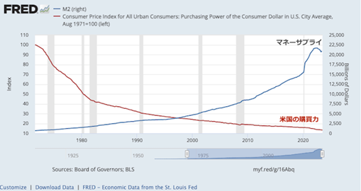紙幣の印刷に制限がなくなったため、米国はさらに多くのドルを稼ぎ続けた…。以下のグラフを見てほしい。青い線は総ドル(M2、マネー供給量の尺度)を示し、赤い線は購買力を示す。米国の購買力は数十年間で 86.6% 減少した。