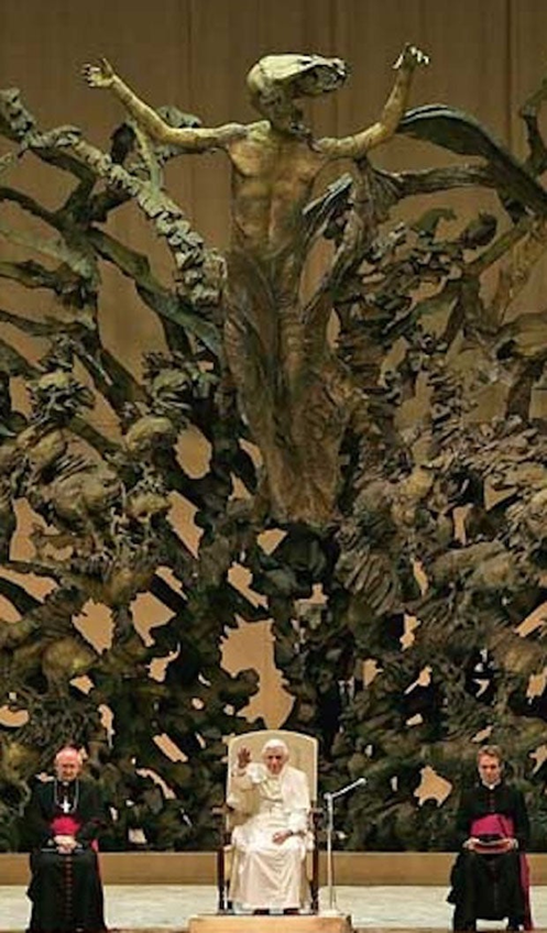 ネットでよく目にするこのラスボスオブジェだが、これはローマ教皇が周に一度一般謁見をする「パウロ6世記念堂ホール」にある、ペリクレ・ファッツィーニ作の彫刻「復活」で、キリストが死から復活しつつある光景を表現したものとの事だ。 pic.twitter.com/jvcpGmsArO